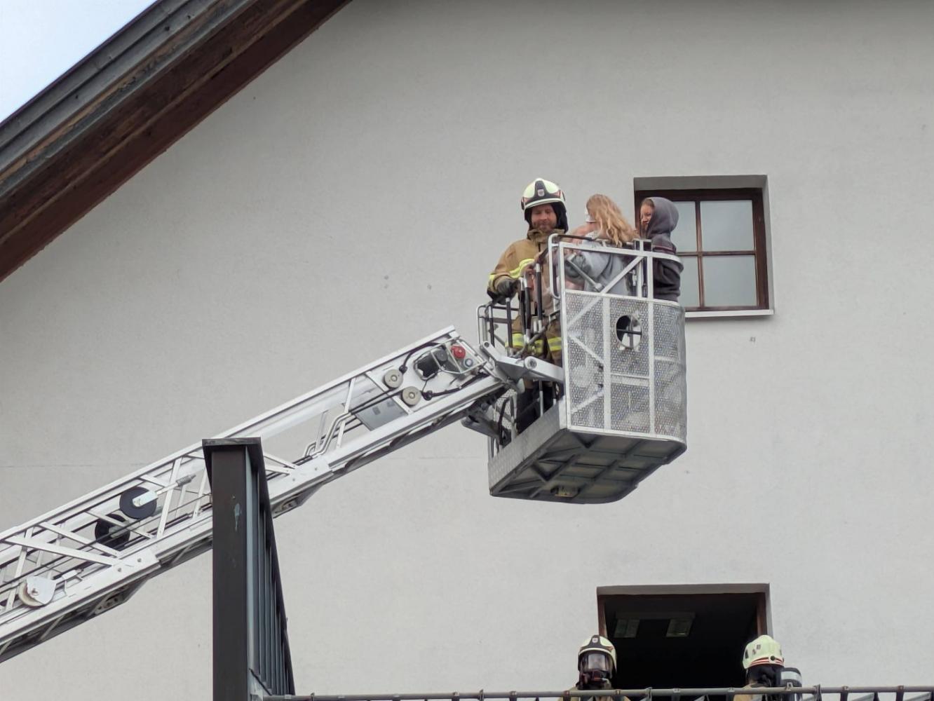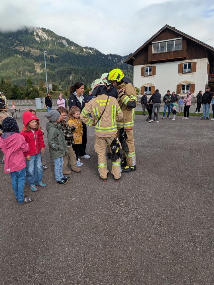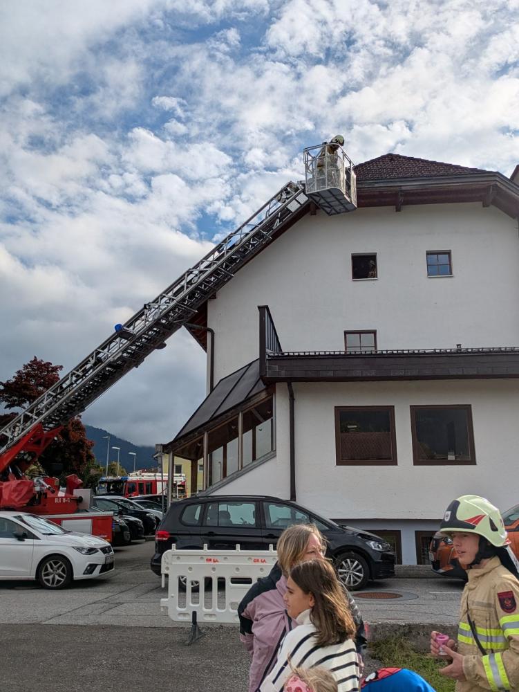 Fast alle SchülerInnen kamen freiwillig in die Schule, um dabei zu sein und für den Ernstfall zu proben. Als der (laute) Feueralarm im Schulhaus losging, kam "Rauch" aus dem Keller. Die Klassen im Erdgeschoß wurden sehr rasch durch den hinteren Notausgang evakuiert. Eine Klasse im ersten Stock musste das Schulhaus über eine Leiter verlassen. Alle Kinder wurden mit einem Gurt gesichert und hinunterbegleitet. Die SchülerInnen vom 2. Stock wurden mit der Drehleiter mit Bergekorb durch ein Fenster in Sicherheit gebracht. Alles klappte wie am Schnürchen und nach ca. 45 Minuten gab die Feuerwehr das Kommando "Brand aus!" Es gab für alle Würstl und Limo in der Feuerwehrhalle.