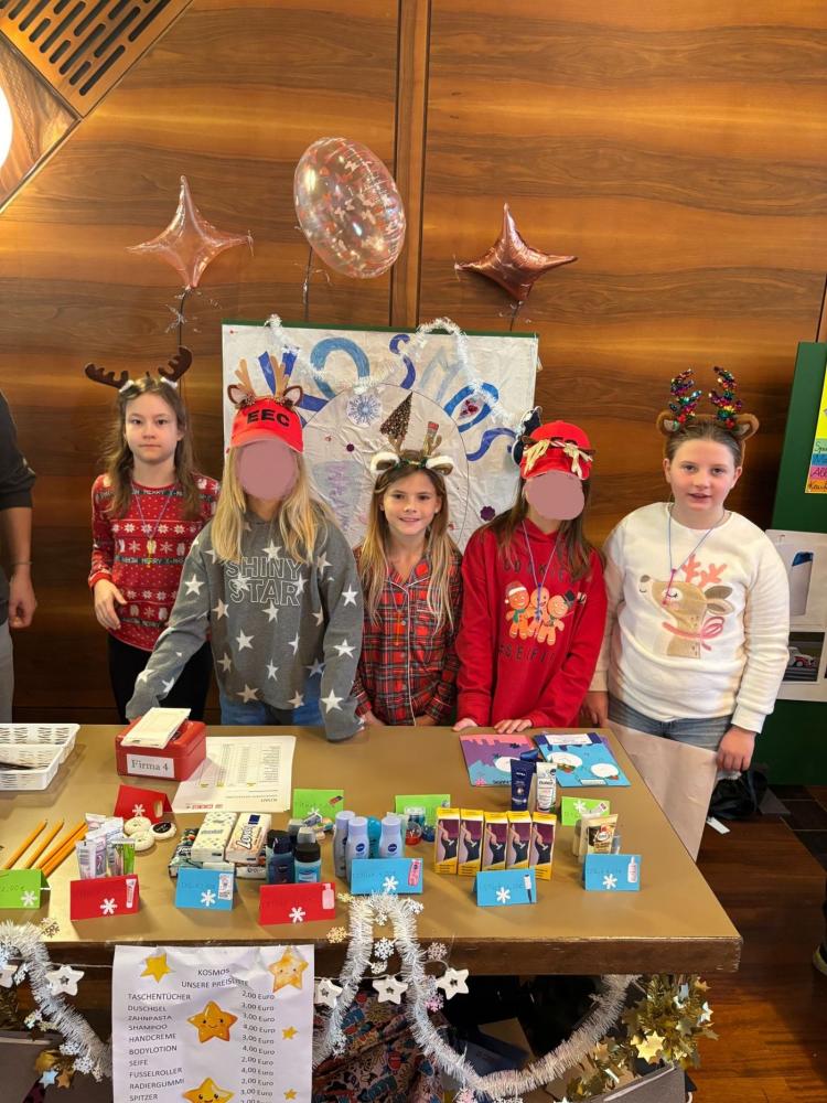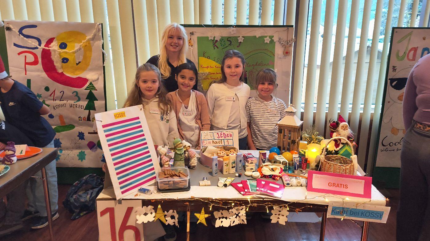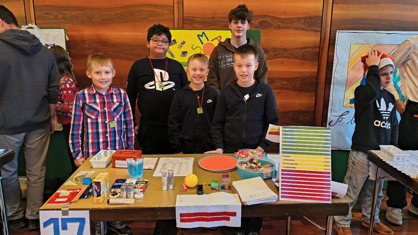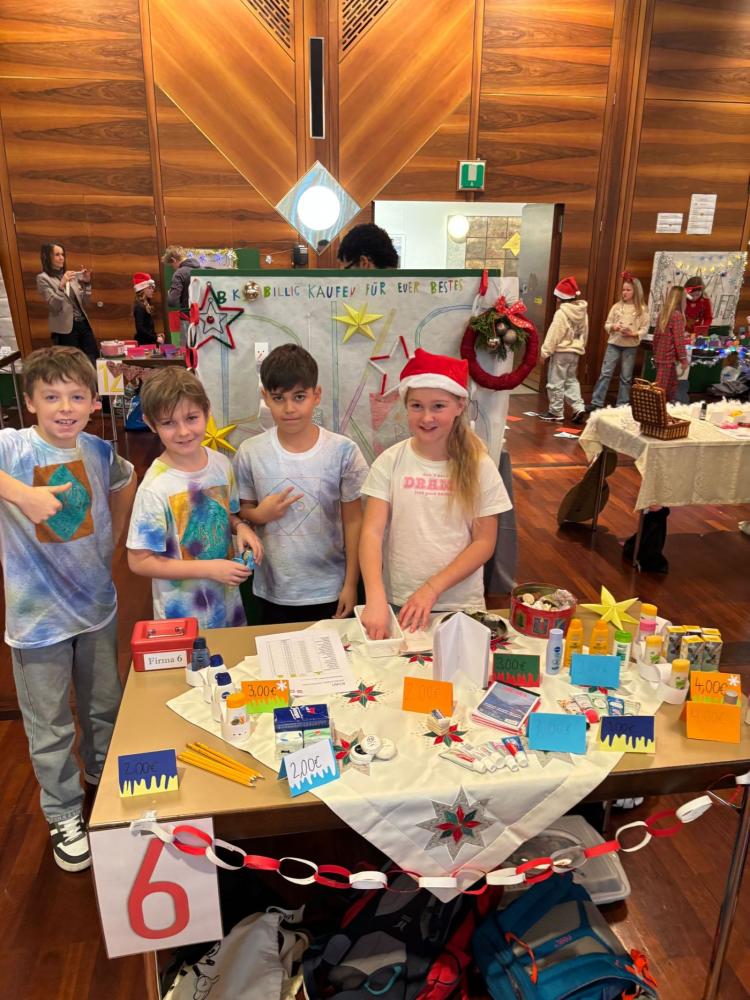 Heute nahmen die 3b und die 4. Klasse mit großem Engagement am KIWI‑Projekt teil. Bereits im Vorfeld arbeiteten die Kinder fleißig an ihren Verkaufsständen: Sie gestalteten Plakate, Preislisten und Flyer und stellten mit viel Kreativität eigene Produkte wie Kekse und Armbänder her.